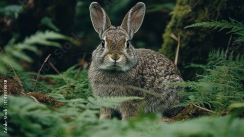 © Big9869, Fototapeta premium Brown Wild Rabbit In Forest Floor Surrounded By Green Ferns With Moss On Tree Trunk Behind.