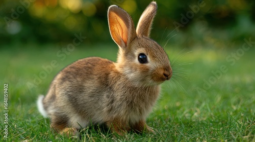 Fototapeta premium Brown wild rabbit sits on lush green grass, bokeh background providing...