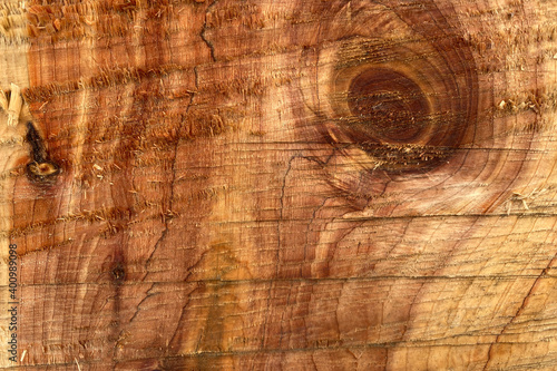 © blinova, Naklejka premium Brown wooden background. A cut of natural wood. Top view. Natural raw non-planed texture timber of coniferous pine. The surface of the table to shoot flat lay in the grunge style. Copy space