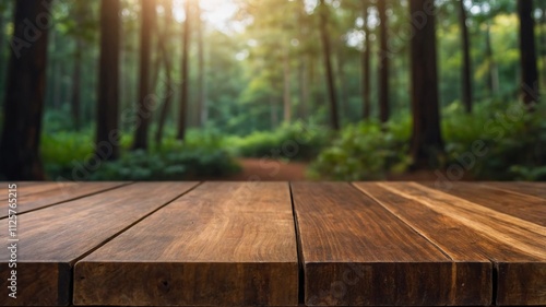© Artem, Fototapeta premium Brown wooden board with forest background display