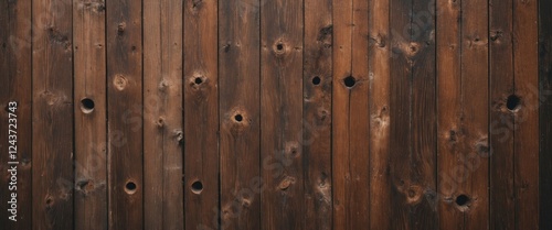 © AkuAku, Fototapeta premium Brown wooden wall texture featuring multiple knotholes ideal for rustic backgrounds or design elements.