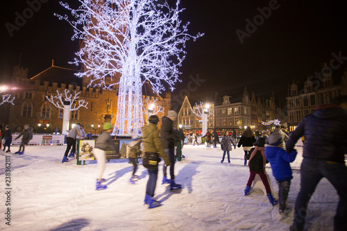 © ANADEL, Naklejka premium Bruges, Belgium - November 24, 2018: Central Bruges Market Square by night decorated at Christmas.