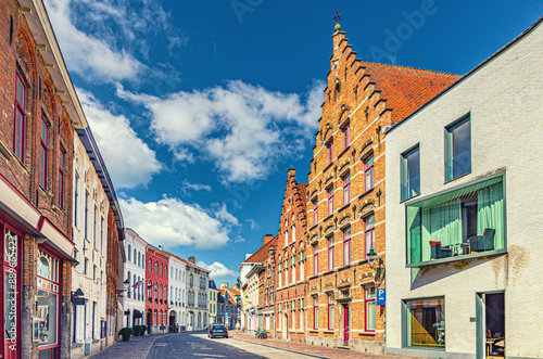 © Aliaksandr, Fototapeta premium Bruges cityscape with paving stone road street, buildings and houses with brick walls and gables in Brugge city historic centre, Bruges old town Sint-Anna quarter district, Flemish Region, Belgium