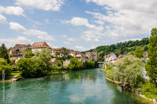 © bill_17, Fototapeta premium Brugg, Aare, Altstadt, Schwarzer Turm, Stadt, Steinbrücke, Brücke, Altstadthäuser, Hofstatt, Ringmauer, Salzhaus, Jurasüdfuss, Aargau, Nordwestschweiz, Sommer, Schweiz