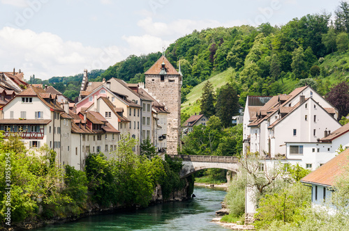 © bill_17, Fototapeta premium Brugg, Aare, Altstadt, Schwarzer Turm, Stadt, Steinbrücke, Brücke, Altstadthäuser, Jurasüdfuss, Aargau, Fluss, Nordwestschweiz, Sommer, Schweiz