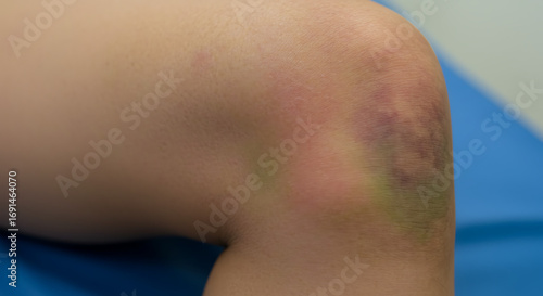 © Nina, Fototapeta premium Bruised knee with varying colors on medical examination table