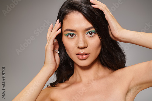 Fototapeta premium brunette asian woman with sparkling green eye makeup and bare shoulders posing on grey background