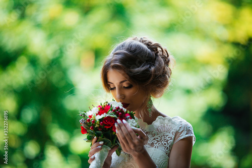 © ostap_davydiak, Fototapeta premium brunette bride in a wedding dress and a bouquet at sunset in the park