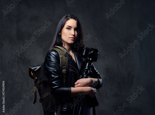 © Fxquadro, Naklejka premium Brunette female photographer holds professional camera on a tripod.