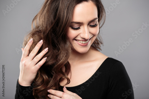 © cherry_d, Obraz premium Brunette girl with healthy curly hair and natural make up . Beautiful model woman with wavy hairstyle .Care and beauty