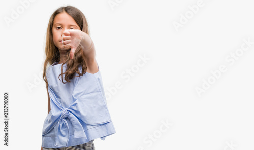 Fototapeta premium Brunette hispanic girl looking unhappy and angry showing rejection and negative with thumbs down gesture. Bad expression.
