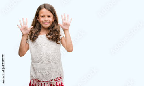 Obraz premium Brunette hispanic girl showing and pointing up with fingers number ten while smiling confident and happy.