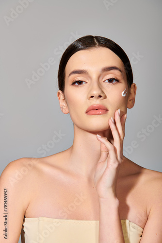 © LIGHTFIELD STUDIOS, Obraz premium Brunette woman oozes elegance in a strapless dress, striking a pose with her hand delicately touching her face.