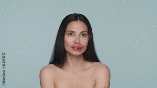 © kinomaster, Obraz premium Brunette woman performs lip skin care procedures. Woman with hydrogel red patches on her lips in the studio on a blue background close up. Healing of dry and chapped lips, hydration.