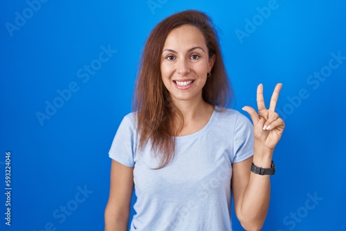 Fototapeta premium Brunette woman standing over blue background showing and pointing up with fingers number three while smiling confident and happy.
