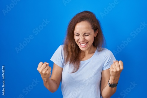 © Krakenimages.com, Fototapeta premium Brunette woman standing over blue background very happy and excited doing winner gesture with arms raised, smiling and screaming for success. celebration concept.