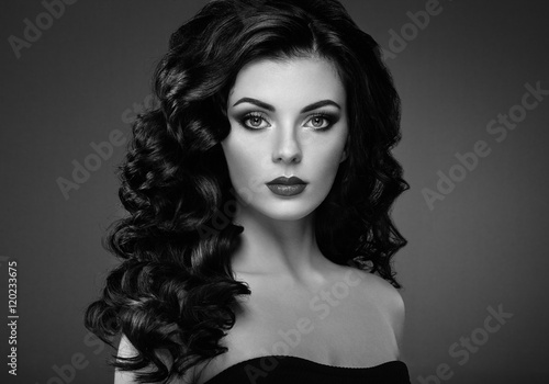 Fototapeta premium Brunette woman with curly hairstyle. Beautiful girl with long wavy hair. Perfect makeup. Fashion photo. Black and White