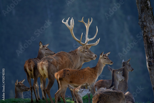 © GERHARD, Fototapeta premium Brunfthirsch mit kahlwild Rudel (Hirschkuh)