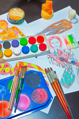 © themanwhophoto, Naklejka premium brushes and colored paint artist on gray background