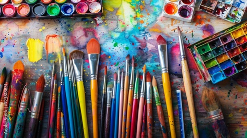 © Creation, Naklejka premium Brushes and watercolor school supplies top view