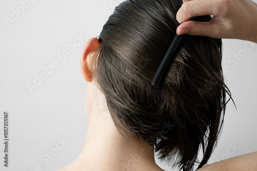 © Victoria Kluy, Naklejka premium Brushing wet hair with comb for healthy care