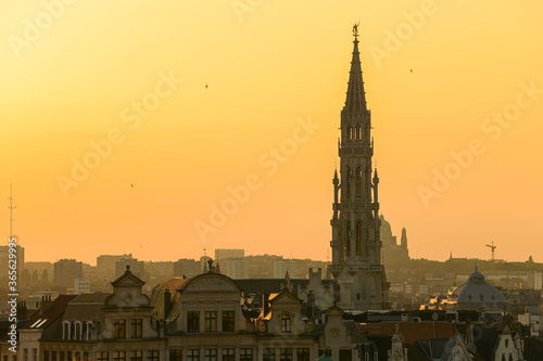 Naklejka premium Brussels / Belgium - 2020: Amazing summer sunset at Garden of the Mont des Arts square with view over the city centre and Grand Place