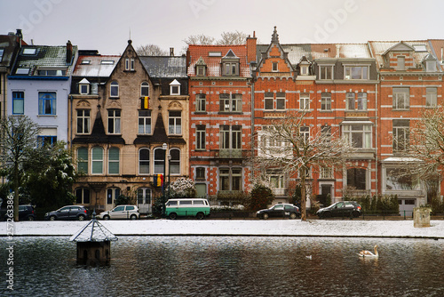 © KURLIN_CAfE, Fototapeta premium BRUSSELS, BELGIUM - JANUARY 30, 2019: Lake near residential areas, fallen snow, Flagey Avenue