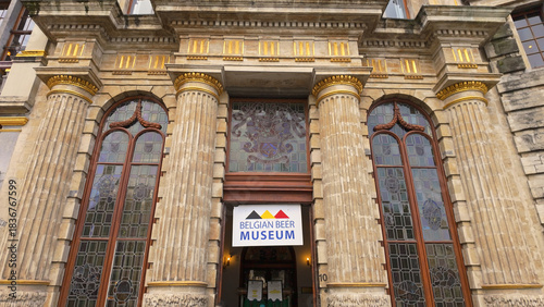 © 4kclips, Naklejka premium BRUSSELS, BELGIUM - NOVEMBER 26, 2025 - Historic building facade with columns and Belgian Beer Museum sign