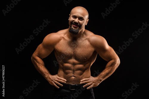 © Stavros, Fototapeta premium Brutal bald man with a beard stands and smiles - photo on a black background.