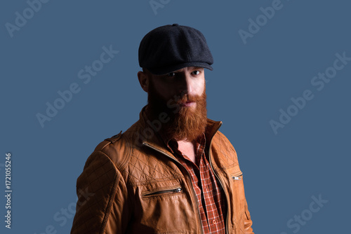 © be free, Fototapeta premium Brutal man in leather jacket. Man in retro peaky cap. Male formal fashion. Brutal bearded guy. Gangster with beard. Bearded man gangster. Stylish Englishman. Retro man isolated on grey