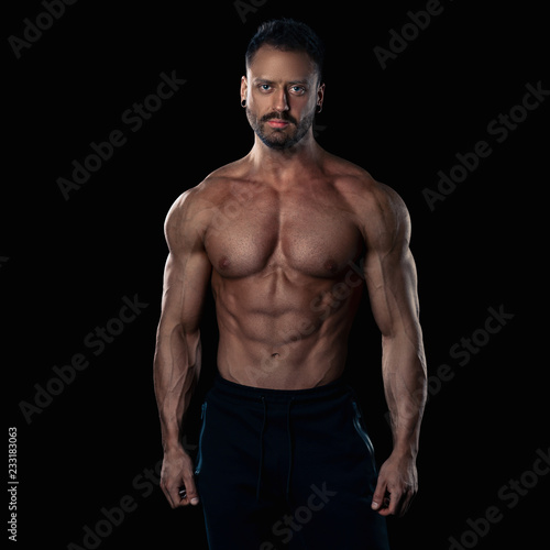 Fototapeta premium Brutal strong bodybuilder athletic man posing on black background.