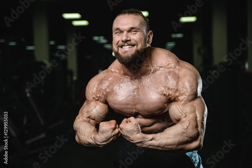 © antondotsenko, Fototapeta premium Brutal strong bodybuilder athletic men pumping up muscles with d