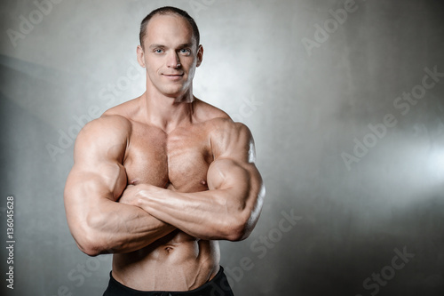 Fototapeta premium Brutal strong bodybuilder man posing in studio on grey backgroun