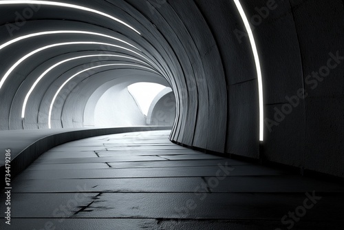 Fototapeta premium Brutalist concrete tunnel interior. Curving modular segments, modern...