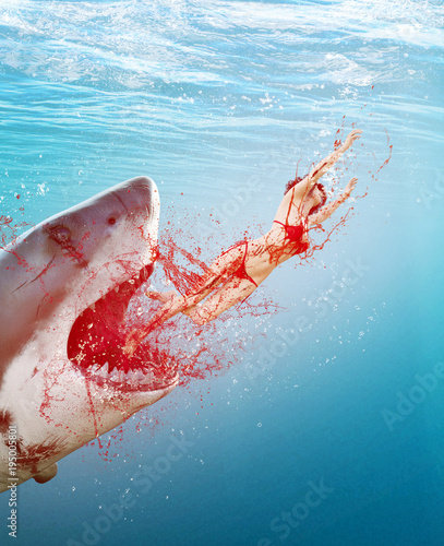 © Joe Therasakdhi, Obraz premium Brutalna scena kobiety atakującej gigantycznego rekina pod głębinami morskimi, krwawa scena, ilustracja 3d na okładkę książki lub ilustrację książki