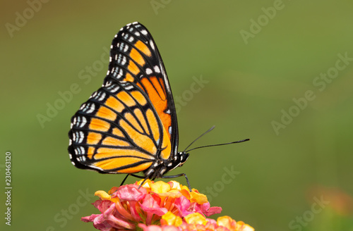 © pimmimemom, Fototapeta premium Brzuszny widok genialny Viceroy motyl na kolorowym Lantana kwiacie przeciw zielonemu tłu
