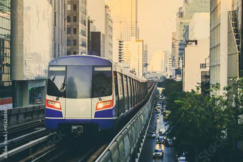 Naklejka premium BTS sky train hight speed for people travelling in capital city Bangkok,...