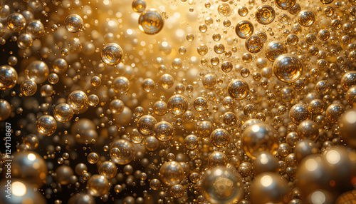 Fototapeta premium Bubbles float upward in a shimmering golden liquid, reflecting light and...