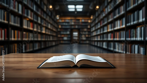 Fototapeta premium Buch offen aufgeschlagen geöffnet auf einem Holztisch vor einer Reihe Bücherregale mit alten Büchern, wie eine Bibliothek, Archiv studieren Literatur Pult Bildung Universität alt Fachhochschule lernen