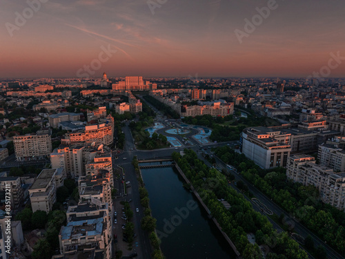 © Dragoș Asaftei, Naklejka premium Bucharest aerial photo. Beautiful view of the landmarks of Bucharest from Unirii area (boulevard, fountains and Palace of the Parliament) during a summer sunrise. Travel to Romania.