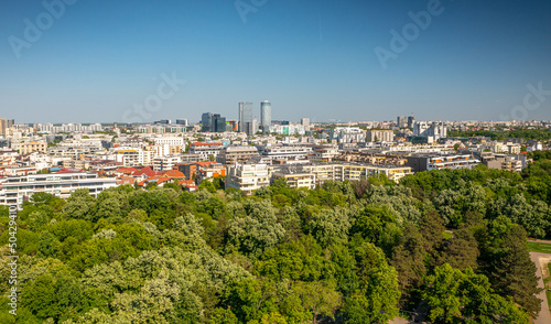 Obraz premium Bucharest from above, aerial view over Herastrau (King Michael I) Park, lake and the north part of the city with office building photographed during a summer sunny day.