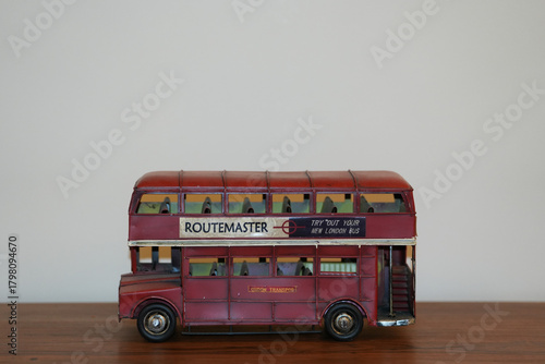 © Cristian, Fototapeta premium Bucharest Romania 16 November 2025.A vintage painting of a classic red English bus displayed on a wooden table. The artwork features the iconic double-decker bus in retro tones.