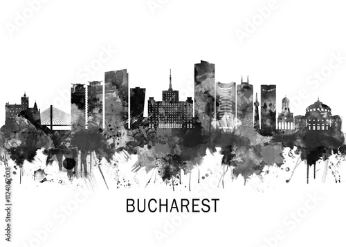 Fototapeta premium Bucharest Romania Skyline BW, cityscape buildings city skyline architecture illustration abstract modern painting travel poster landscape print urban art