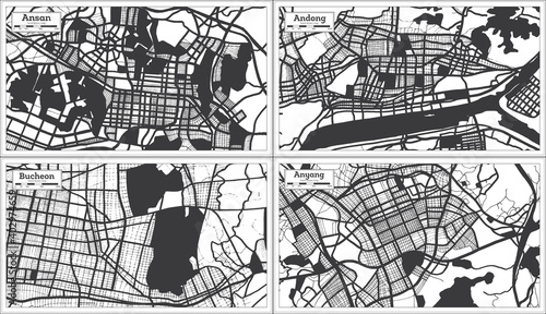 Naklejka premium Bucheon, Andong, Anyang and Ansan South Korea City Maps Set in Black and White Color in Retro Style.