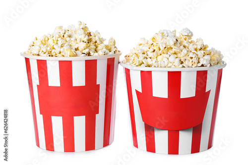 © Pixel-Shot, Fototapeta premium Buckets with tasty popcorn on white background