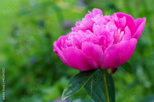 Fototapeta premium Bud of pink peony bud close up on blurred background in garden
