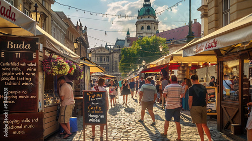 © Swaroop, Obraz premium Buda Castle filled with wine stalls, people tasting Hungarian wines, enjoying traditional music and dance."