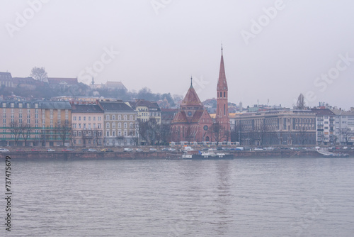 Fototapeta premium Buda Castle Matthias Church and Danube River in Budapest, Hungary.
