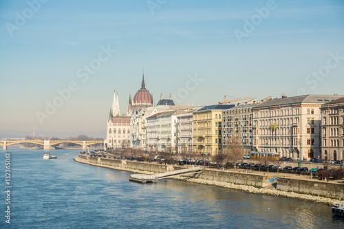 Naklejka premium Budapest famous parliament building at riverbank, hungary