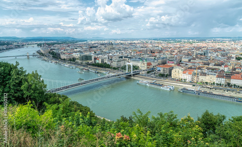 Obraz premium Budapest, Hungary, August 29, 2019: the Danube River bridges and the panorama of Budapest, the capital of Hungary, in the summer. A tourist trip to the ancient metropolitan cities of Europe